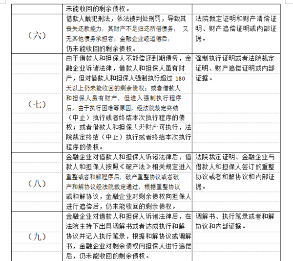第十条 借款人在不同金融企业的多笔债务,当其中一个金融企业经过诉讼或仲裁并取得无财产执行的终结(中止)执行或者终结本次执行程序的裁定,或者虽有财产但难以或者 无法执行的终结(中止)执行或者终结本次执行程序的裁定,对于该借款人的担保条件不超 过该笔债务的其余债务、其他金融企业可以依据法院或仲裁机构的裁定、内部清收报告及法 律意见书核销。